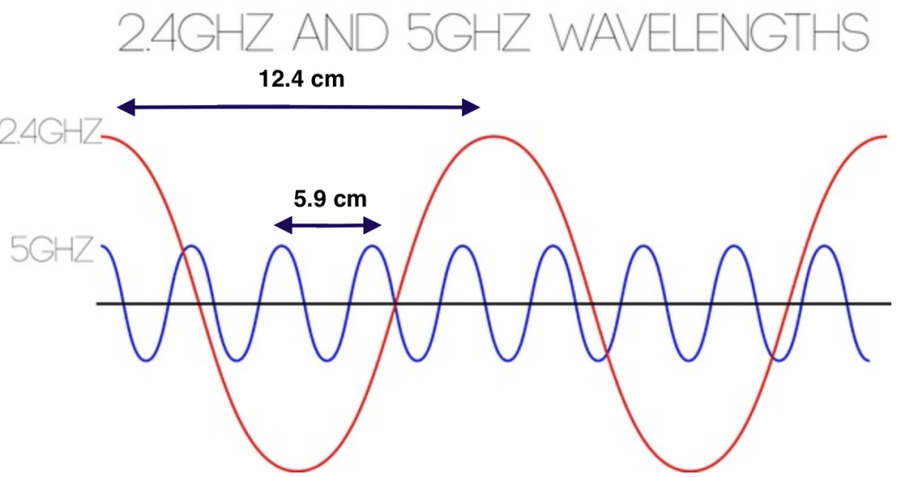 So, for a frequency of 2.4 GHz, the wave cycles oscillates for 2.4 x 109 = 2400000000 per second and for 5 GHz wave cycles oscillates for 5 x 109 = 5000000000