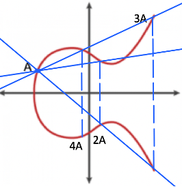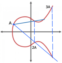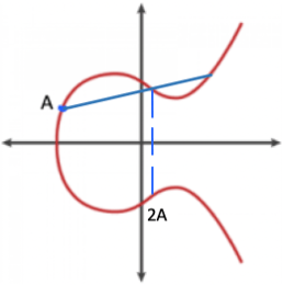 Then considering a finite line between points A and 2A on the elliptic curve, mark the point of intersection and flip back to the initial dimension of the curve and