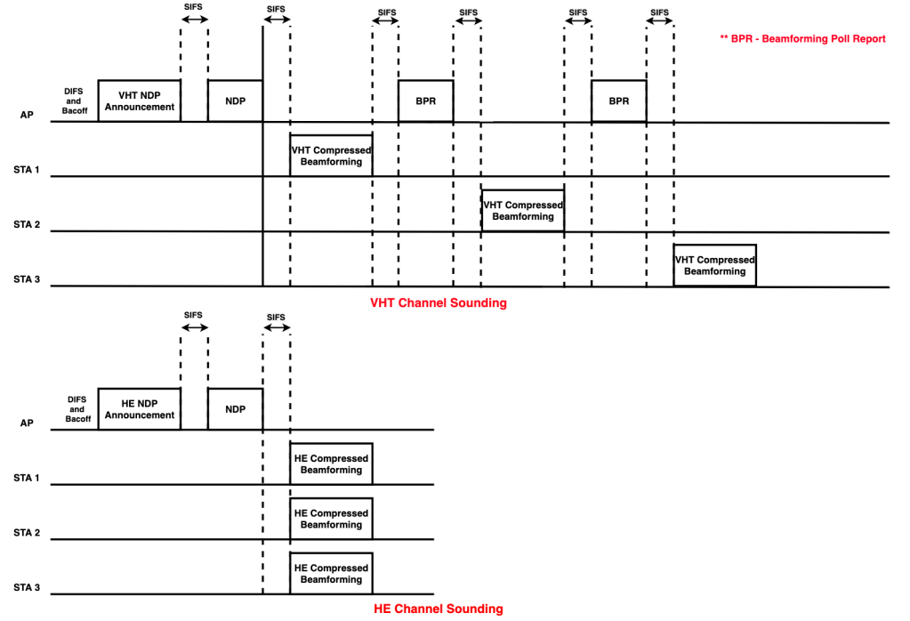 Below frame sequence gives an idea of how HE and VHT channel sounding would look in a Multi-User scenario: