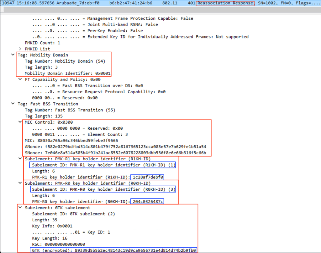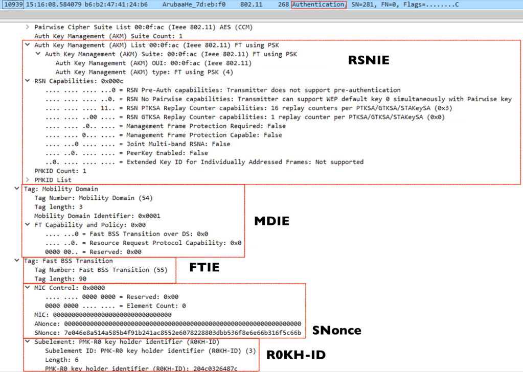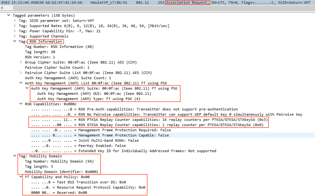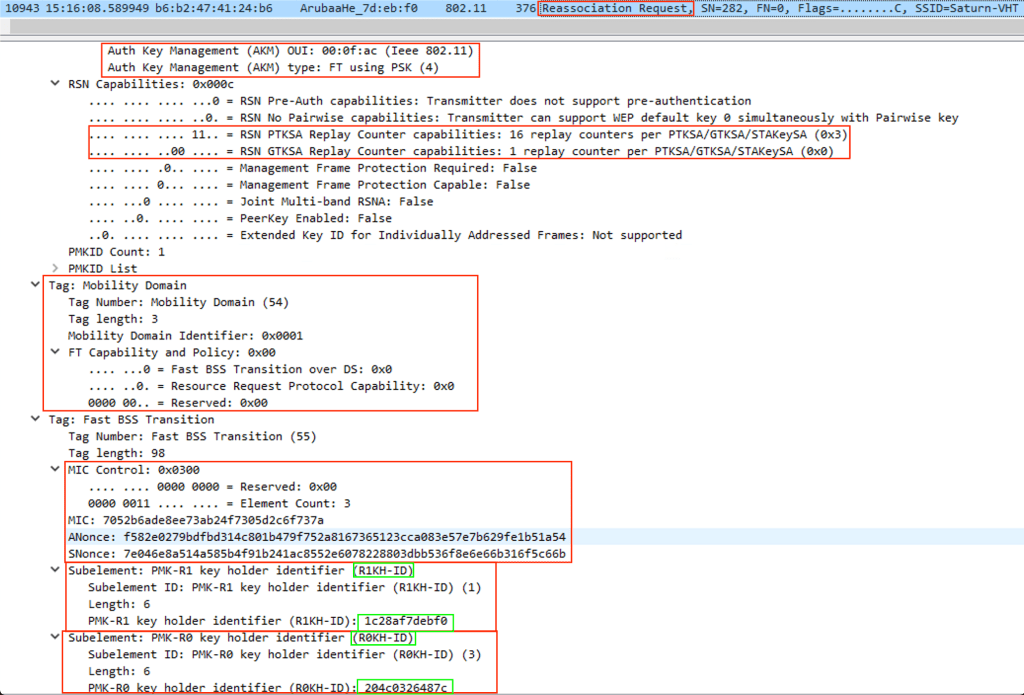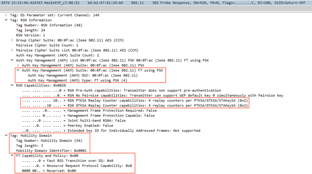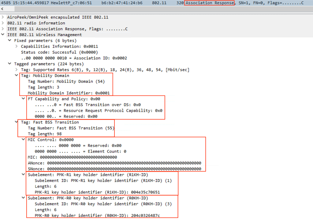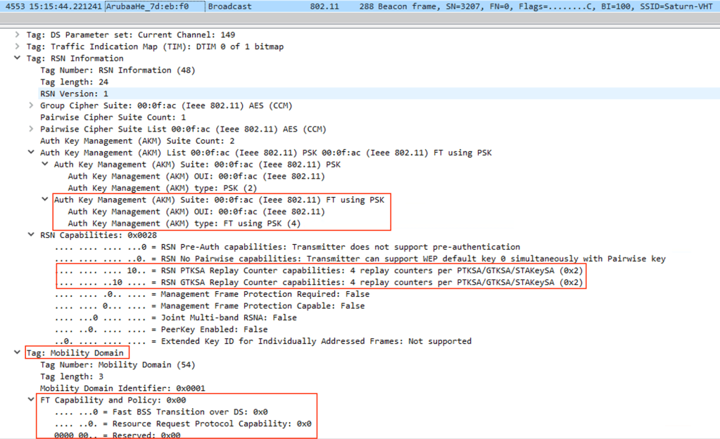 After enabling 802.11r, the AKM suite under the RSN Capabilities field will exhibit the AP/controllers’ ability to use Fast BSS Transition.