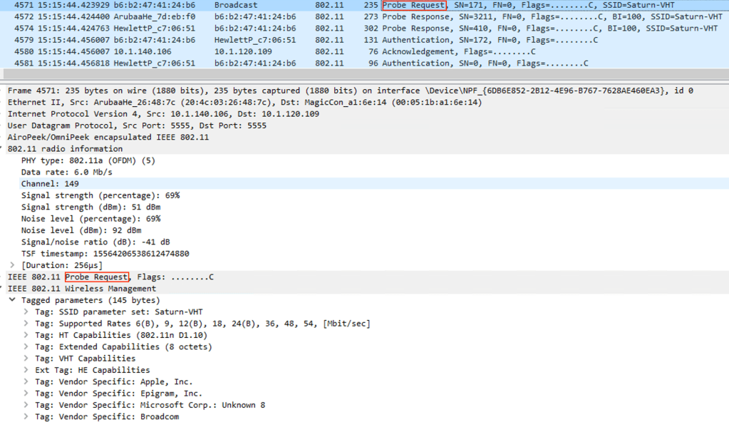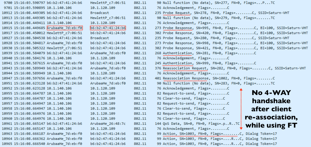 Before running the below tests, I enabled 802.1r on Aruba Controller and took captures while AP’s were operating on channel 149E