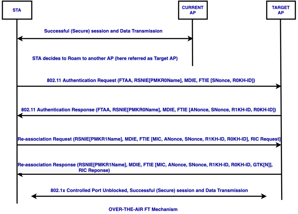When using Over-The-Air FT mechanism, the client while deciding to roam to a new AP, will directly communicate to the Target AP and using the authentication and re-association frames (instead of 4-way key exchange) to generate PTK and GTK keys to protect the 802.11 data frames
