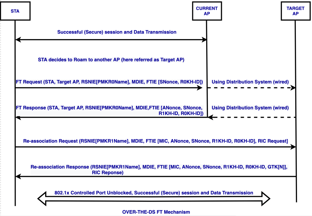 Here client changes its channel to the target AP and sends 802.11 auth frame with the Authentication Algorithm set to Fast BSS Transition. - Over-the-DS – This is done over the DS.
