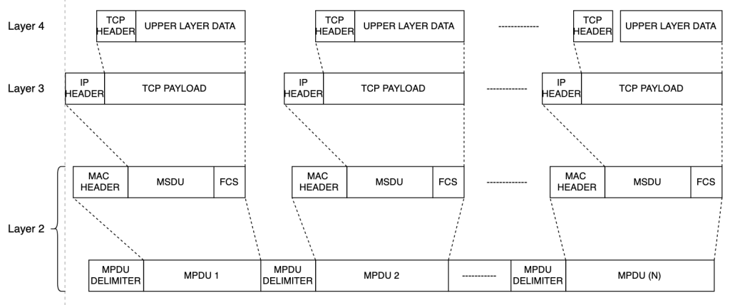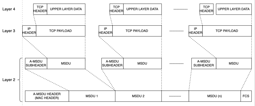 A-MSDU was first introduced in 802.11n networks and is build by combining multiple MSDU’s known as A-MSDU subframes.