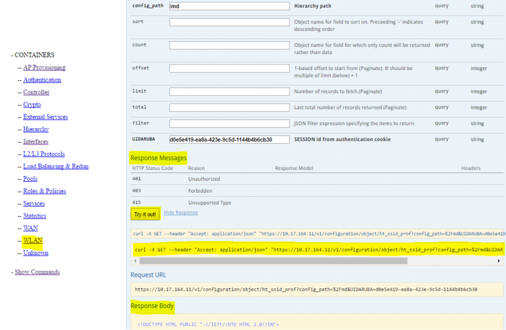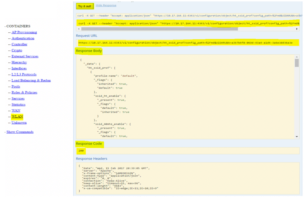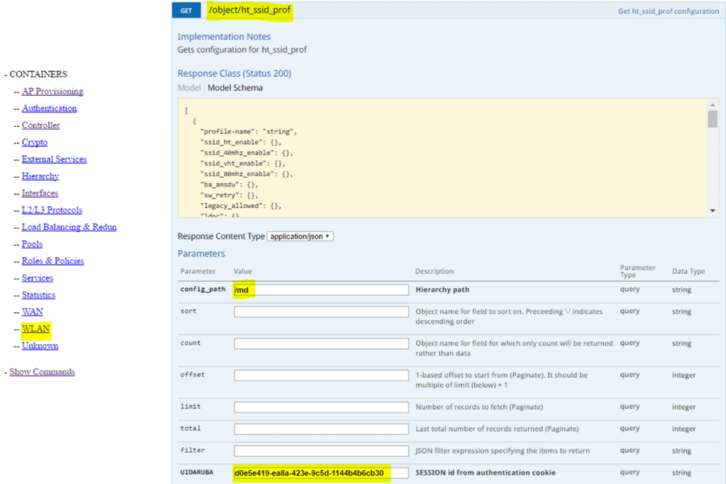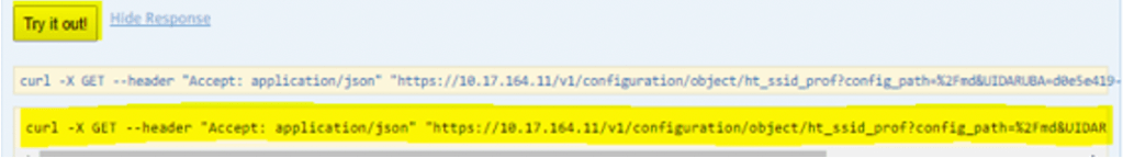 curl -k -b “aruba-cookie” -X GET –header “Accept: application/json” https://10.17.164.11/v1/configuration/object/ht_ssid_prof?config_path=%2Fmd&UIDARUBA=d0e5e419-ea8a-423e-9c5d-1144b4b6cb30