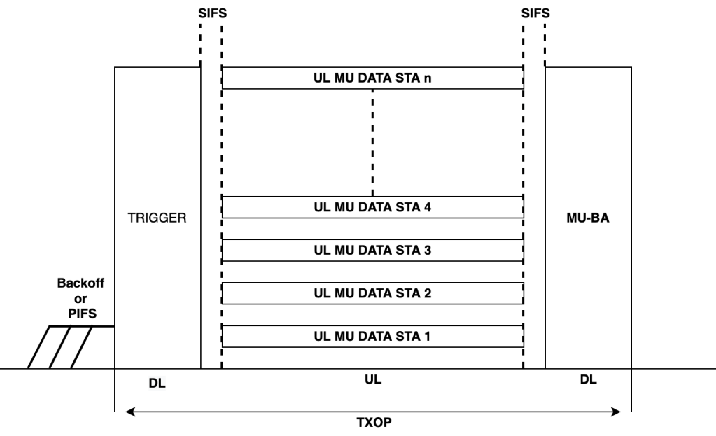 - To coordinate uplink MU-MIMO or uplink OFDMA transmissions the AP sends a trigger frame to all users.